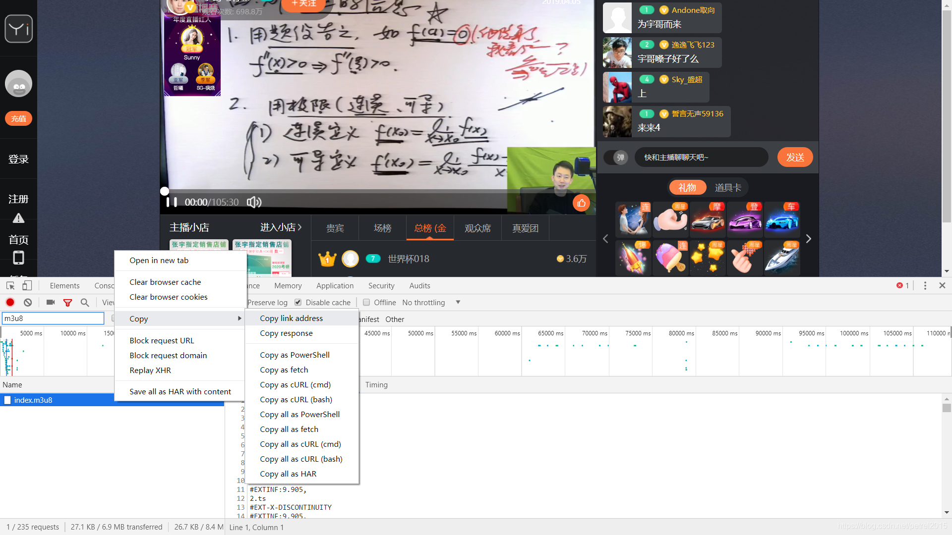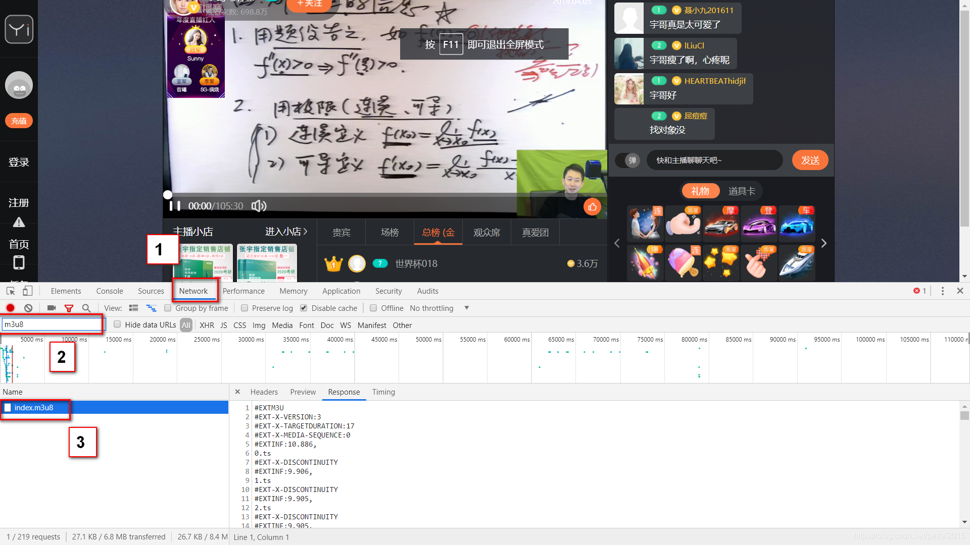 Step 2: 在右边菜单栏的“Network”,刷新页面,在Filter里输入m3u8搜索,